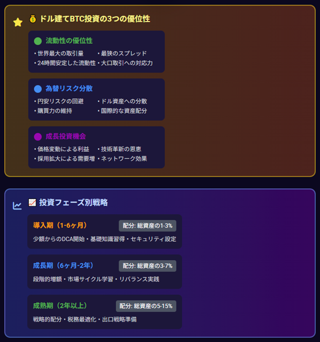ビットコインをドル建てで購入することは、リスクを賢く利用しながらグローバルな資産構築を目指す最適な方法です。仮想通貨市場が成熟しつつある今、ドル建て購入するという選択は単純取引手段ではなく、次世代の「国際投資戦略」でもあります。