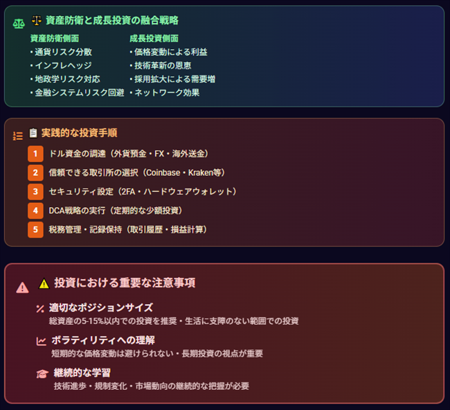 自分もドルを作ってビットコインを少額購入してみた際、基準と価格の動きを同時にチェックする必要があることを認識しました。その分、資金管理の意識が大きく変わり、考えて「買う」から「戦略的に保有する」投資へと進化しました。